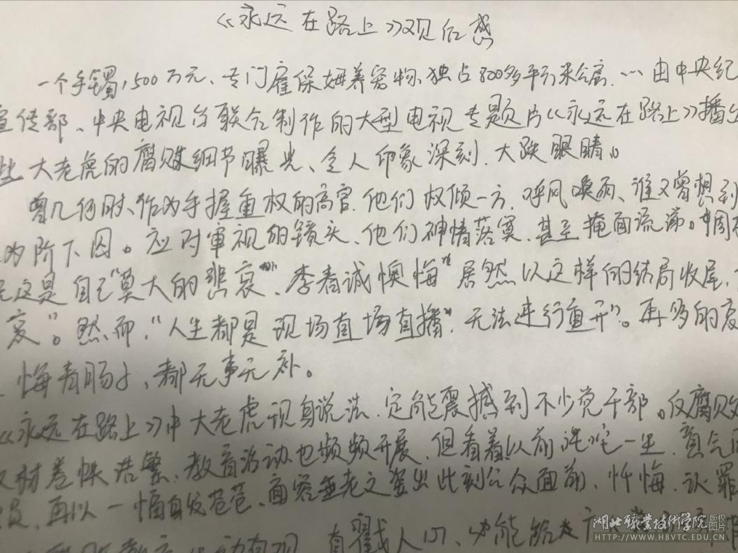 《永远在路上》是由中央纪委宣传部、中央电视台联合制作的一部反腐纪录片,该片通过几起典型案例,深刻剖析了形式主义、官僚主义、享乐主义和奢靡之风产生的根源及严重危害。观影过程中同学们聚精会神,其中部分学生还写下了些许观影感想。