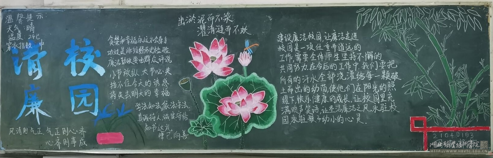 为推进“清廉校园”建设工作落实落地,把清廉教育纳入学生思想政治教育当中来,让廉洁教育贴近实际、贴近生活、贴近学生,营造风清正气的学习和工作环境,2021年9月中旬至10月上旬,beat365vip官网登录入口各班级组织开展“清廉校园”主题板报活动。