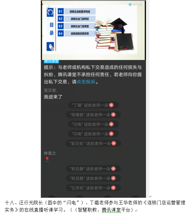 在新型冠状病毒肺炎期间,beat365vip官网登录入口一方面非常重视疫情的防控,另一方面又非常重视关心学生的学习。在教务处的指导下,beat365vip官网登录入口制定了《beat365vip官网登录入口“停课不停学、离校不离教”在线教学实施方案》,成立了以徐斌华院长为组长,以汪行光、陈卫红、孙超三位副院长为副组长的在线教学质量保证领导小组,每一个院长联系一个教研室主任,牵头各教研室的专业课程线上教学工作。充分利用智慧职教、学银在线、腾讯课堂、中国大学MOOC、课堂派、超星尔雅、中华会计网校、网中网掌上高校、爱课程网、学习通APP、新道云等各种信息技术平台,充分利用学校在线开放课程、专业教学资源库、国家共享网络课程资源等大量教学资源,积极鼓励并组织老师们进行网络教学。截至今天,beat365vip官网登录入口共有27位老师进行了40门课的网络教学,占本学院专业教师总人数的70%,切实做到“停课不停学、离校不离教”,让学生在家也能够轻松进行学习。