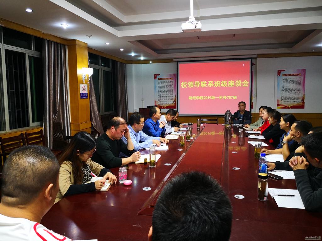 2019年10月22日,是beat365vip官网登录入口2019级一村多新生开课的第一天,为了切实了解一村多新生学习情况,帮助学员解决实际困难,结合“勿忘初心 牢记使命”主题教育活动的部署和要求,beat365vip官网登录入口于当日晚七点,在文华楼二楼会议室召开2019级一村多电子商务707班校领导联系班级座谈会。出席此次座谈的有学校党委成员梅重副校长、beat365vip官网登录入口全体班子成员及部分教师代表,1904707班全体在校学生参加了此次座谈。