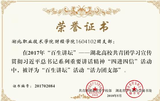 日前,beat365vip官网登录入口收到共青团湖北省委学校部、湖北省学联秘书处联名颁发的荣誉证书,1604102班团支部在2017年“百生讲坛”-湖北高校共青团学习宣传习近平总书记系列重要讲话精神“四进四信”活动中被评为“百生讲坛”活动“活力团支部”。
