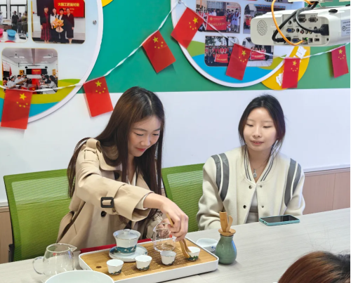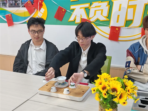 同学们积极参与体验,在实践中亲手泡茶、奉茶,见证了茶叶在水中舒展、茶汤逐渐金黄透亮的奇妙变化,也体悟到泡茶时专注当下的心境。在郭柯颖同学的耐心指导下,同学们认真学习温杯、置茶、冲泡、奉茶等步骤,一招一式都学得有模有样,专注于每一个细节,力求将茶汤的色香味展现到最佳状态。小小的一杯茶,已然超越饮品范畴,成为同学们修身养性、提升文化素养的独特媒介。