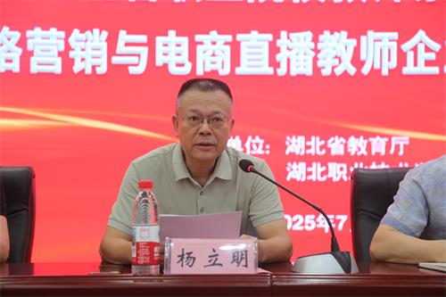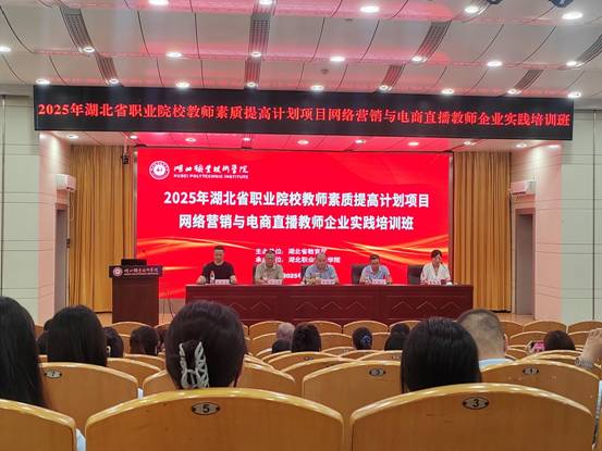2025年7月21日上午,由湖北省教育厅主办,beat365vip官网登录入口承办的2025年湖北省职业院校教师素质提高计划教师企业实践(网络营销与电商直播)培训班开班仪式在西区文博馆学术报告厅圆满举行。孝感市教育局副局长邹德平、beat365vip官网登录入口副校长杨立明、专家代表湖北工程学院二级教授、湖北名师江胜清、湖北冰点文化传播有限公司总经理熊传兵、继教学院院长丁浙英、财经与旅游学院党总支书记徐斌华等出席会议,会议由财经与旅游学院院长曹艳芬主持。来自全省中高职院校60名教师齐聚一堂,共同开启为期28天的知识与技能的提升之旅。