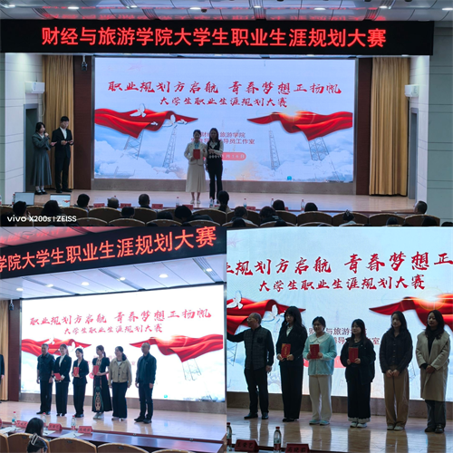 11月16日晚,财经与旅游学院2025年大学生职业生涯规划大赛决赛在西区学术报告厅隆重举行。学院学工副院长张星月、组织员黄曙光、学工办主任王峰、团总支书记祝非凡、学工助理柳春祥、全体专职辅导员以及200余名学生代表齐聚一堂,共同见证这一精彩时刻。