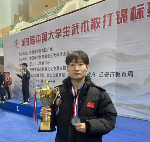 代鑫海的另一个身份,是校散打队的核心队员。在教练团队的精心指导下,他与队友们刻苦训练,作风顽强。在2025年中国大学生武术散打锦标赛上,他凭借顽强的意志、精湛的技术和稳定的心态,勇夺个人亚军和团体亚军,闪耀全国赛台。2025年11月,他的武术造诣再获权威认可,被中国武术协会授予散打项目六段称号。从县级田径赛场的奔跑,到全国散打赛台的搏击,他不断挑战自我,展现了卓越的体育素养和拼搏精神。