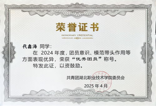 青春因奋斗而出彩,人生因追求而崇高。作为一名共青团员,代鑫海自踏入湖职校园起,便将坚定理想信念摆在首位。2024年9月,他郑重递交入党申请书,积极向党组织靠拢。在后续的培养考察中,他认真学习党的理论,甘于奉献,表现出色,于2025年4月被确定为入党积极分子,并荣获2024年度“优秀团员”称号。思想上的积极进取,为他各方面的成长奠定了坚实的基石。