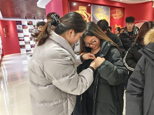 仪式在庄严的团歌声中拉开序幕。现场通过讲解团旗、团徽、团歌的历史内涵与象征意义,加深新团员对团组织文化的理解,强化其身份认同感和使命感。随后,新团员们列队走上台,佩戴上闪耀的团徽,一枚枚团徽不仅是共青团员的身份象征,更寄托着为青春使命不懈奋斗的郑重承诺。在主持人的带领下,全体新团员面向团旗庄严宣誓,铿锵有力的誓言回荡在现场,彰显着他们“听党话、跟党走”的坚定决心,以及为共产主义事业贡献青春力量的赤诚初心。