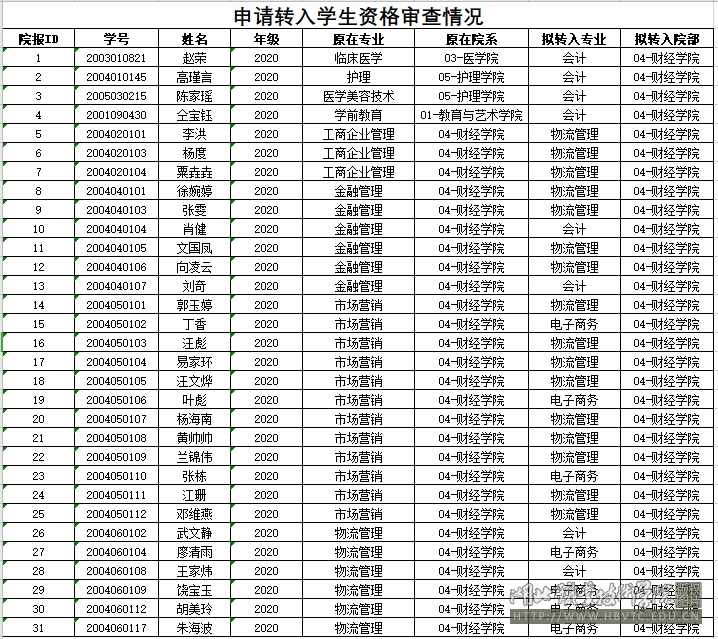根据《普通高等学校学生管理规定》(教育部令第41号)、《省教育厅关于普通高校转专业有关工作的通知》(鄂教学[2014]4号)和《beat365vip官网登录入口学生管理规定》(鄂职院发[2017]28号)以及《关于印发< beat365vip官网登录入口学生转专业管理办法(试行)>的通知》(鄂职院发[2019]21号)的相关规定,经学生本人申请、转出院(系)研究、我院讨论,拟同意以下同学的转专业申请,现予以公示。公示期间如有异议,请与beat365vip官网登录入口联系,以单位名义反映的,须加盖本单位公章;以个人名义反映的,应署真实姓名和联系电话。我们将对反映的问题进行调查核实,并对反映人保密。